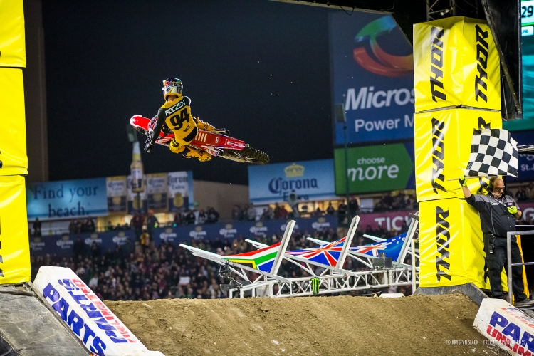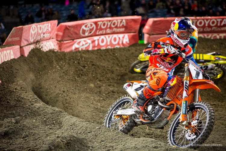 If anyone was going to be the most viable option for giving Ryan Dungey a run for his money on his quest for a Supercross championship three-peat, it was likely to be Ken Roczen. Ken started off the season perfectly – winning all the heats he competed in and all of the Main Events. In Anaheim, however, Ryan Dungey would move into the lead very shortly after the gate dropped. The Champ maintained a lead the entire 20 Minute + 1 Lap Main Event and with Ken’s unfortunate crash, Ryan would also move into the points lead for the first time this season.