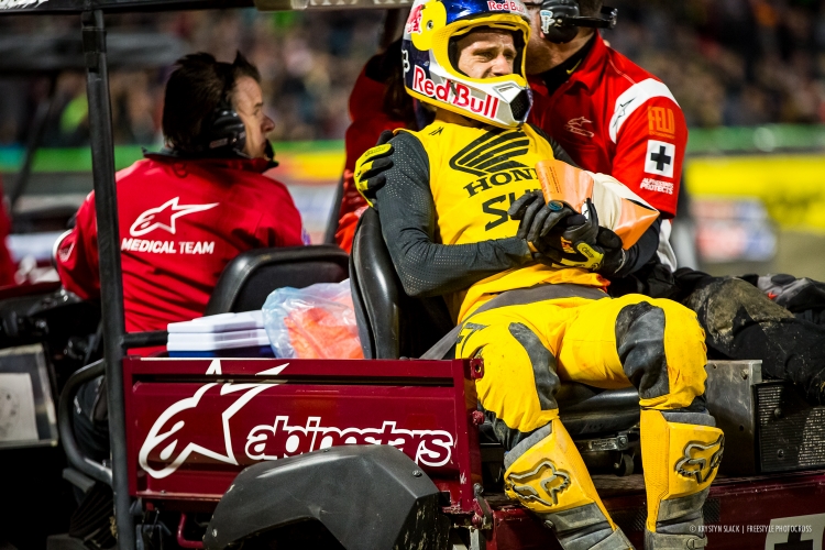 Kenny started the night with his third Heat Race win on the season after qualifying 4th during practice. During the Main Event, Ken got off to an unusually bad start for the #94, especially for this season, and was recorded in 7th after the first lap. He would work his way up to 3rd place before disaster struck. Nearly half way through the 20 minute + 1 lap Main Event, Kenny hit a soft spot on the track that would send him catapulting over the bars, slamming into the face of a jump. It was in that moment, the series changed. We would later find out that Kenny sustained a compound fracture of the left radius, a dislocated left wrist, and a dislocated left elbow. The #94 now faces a long road to recovery dotted with many surgeries along the way. Unfortunately for Kenny, and for the series, his 2017 season has come to a screeching halt for the Honda rider. It is unknown, yet, if Roczen will be back for the Lucas Oil Pro Motocross Season, or if we’ll have to wait until 2018 until K-Roc makes another run for the championship. Fans and riders alike will miss seeing the #94 the rest of the 2017 Monster Energy Supercross Season. Best wishes on a quick recovery, Kenny!
